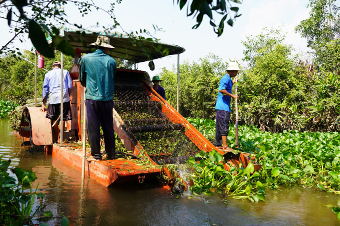 Người dân sử dụng máy vớt lục bình trên sông thuộc huyện Thủ Thừa, Long An. Ảnh: Hoàng Nam